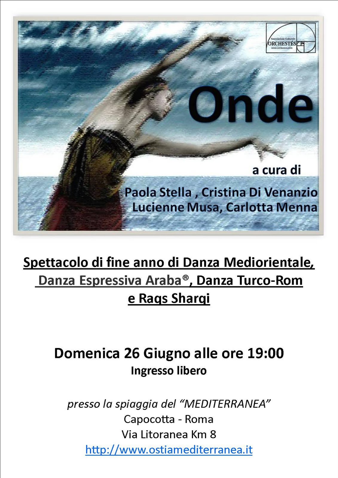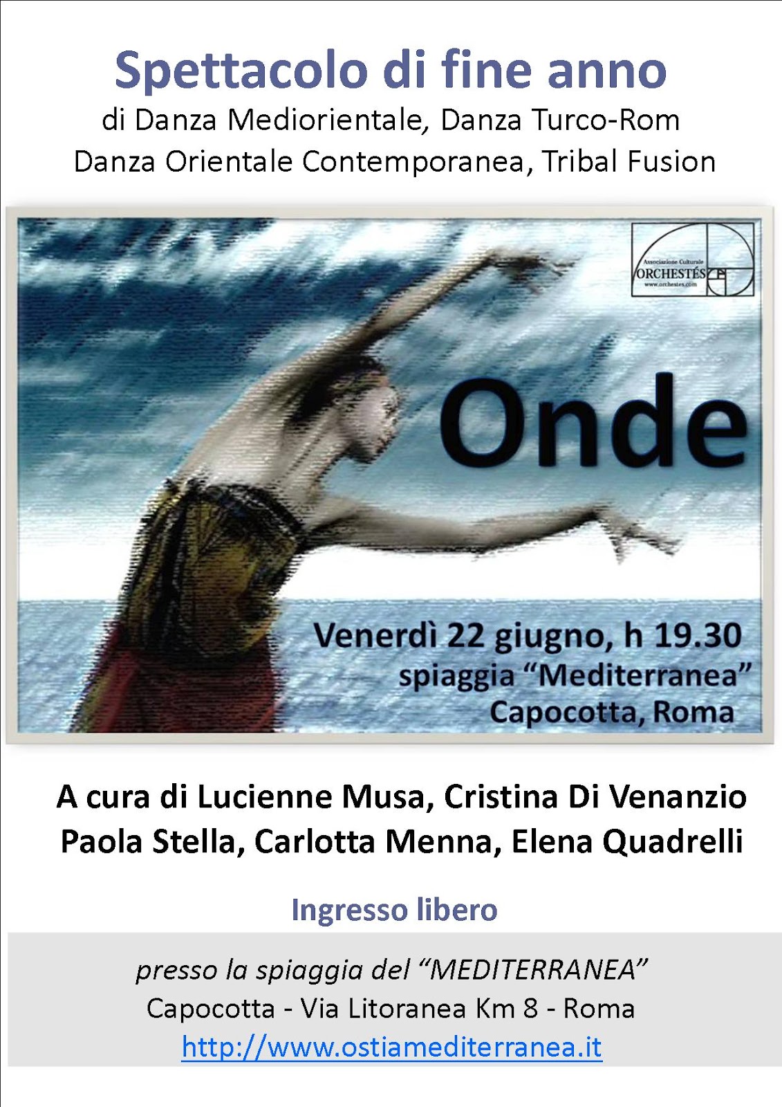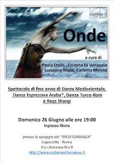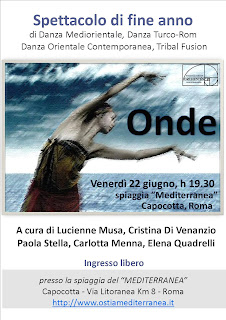Spettacolo di fine anno delle allieve dei corsi di Cristina Di Venanzio, Carlotta Menna, Elena Quadrelli, Lucienne Musa e Paola Stella, con esibizioni di danza orientale contemporanea, teatro danza, raqs sharqui, folklore nord-africano, turco-rom e tribal fusion al tramonto in riva al mare.